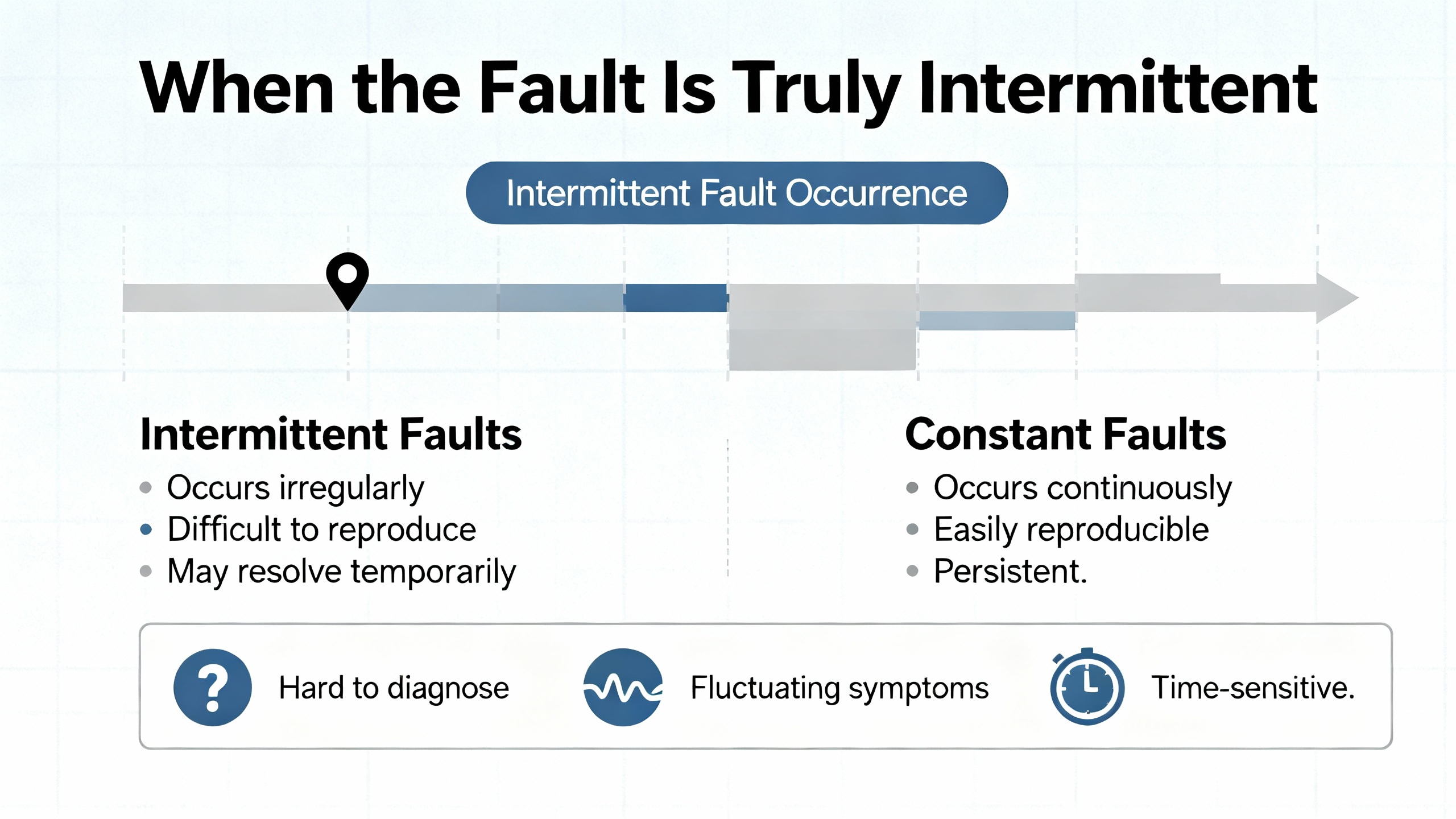 | Random trips with “no problem found” after part swaps | External influences, ground loops, power sag or spikes | Instrument with triggers, capture supply voltage, motor current, and speed traces, correlate with neighbor equipment events; add isolation or filtering where indicated |