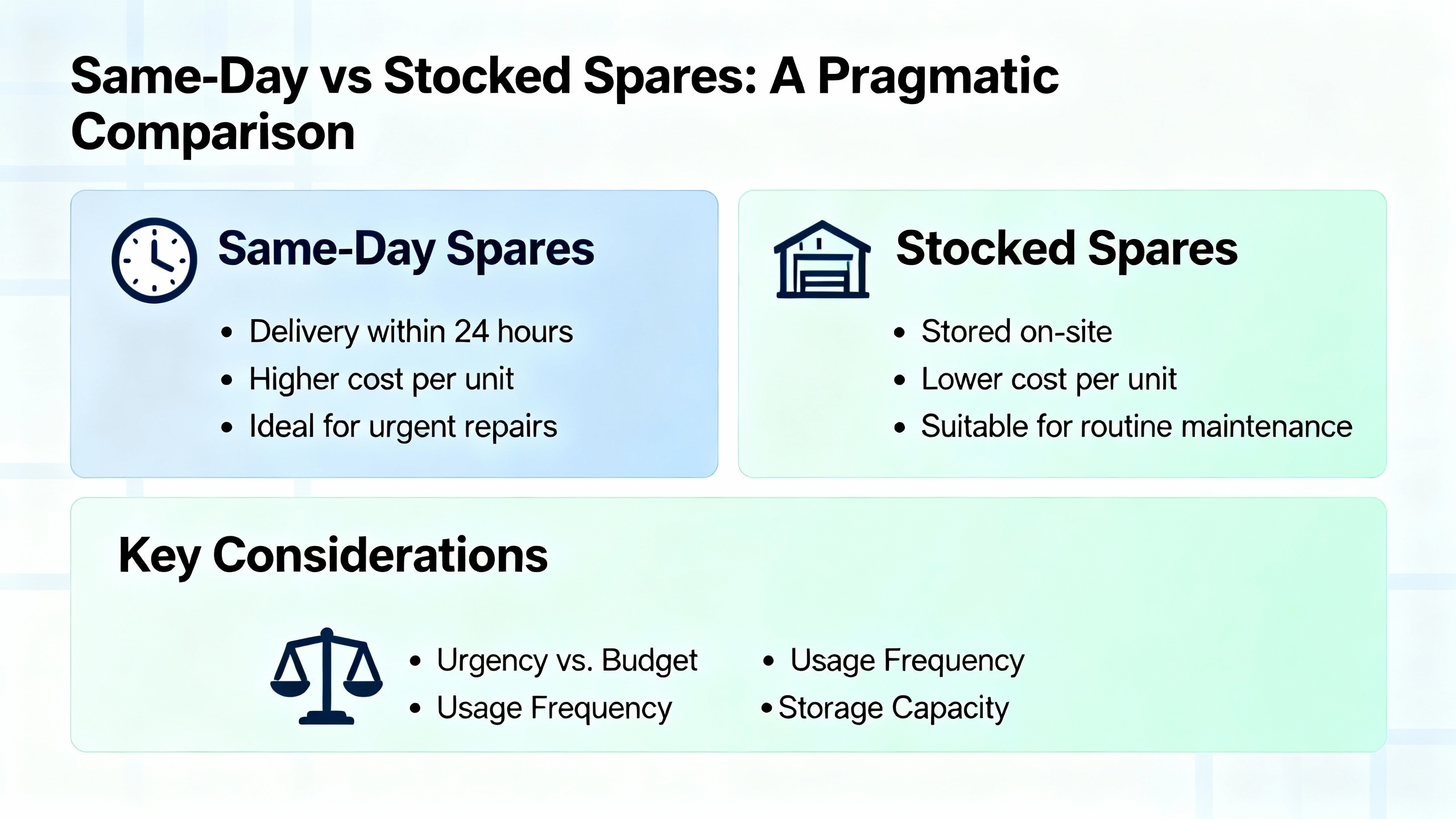 Different plants will land at different places on the spectrum between heavy on-site spares and heavy reliance on same-day logistics. It helps to compare the approaches in a structured way.